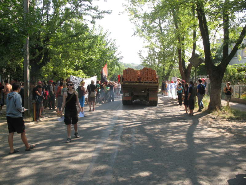 Таким образом, от 30 до 40 человек приехали в охраняемый военными лагерь заключения мигрантов, в глубине леса. Там заключены мужчины, арестованные при попытке перехода через границу. Лагерь совершенно переполнен, туалеты не работают, не хватает питьевой воды. Ситуация в этом месте – полная человеческая катастрофа, и очень хорошо показывает бесчеловечность и брутальность Европейского граничного режима. Перед воротами были проскандированы лозунги, устроен шум и развернуты транспаранты. Заключенные приветствовали акцию, махая руками из окон и выходили перед бараками.